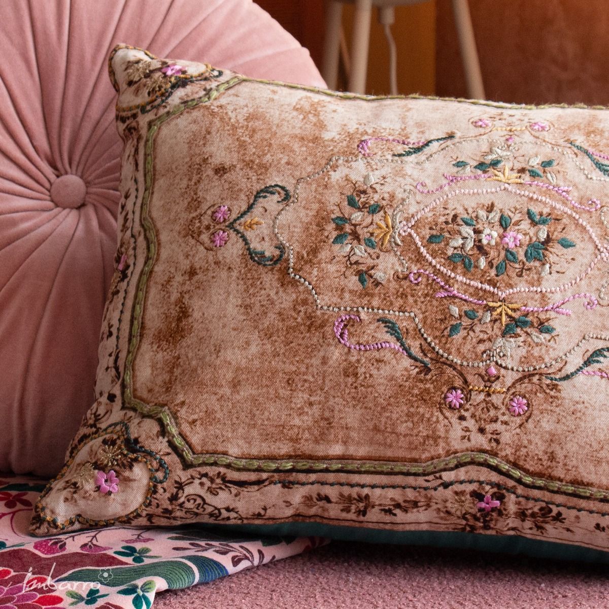 Eigenzinnig ten top: chique, vintage, romatisch en zelfs een beetje retro… kussen Lalou. Levendige kleuren samen met verfijnde borduursels en afgewerkt met gouddraad. Laat je leiden door de romantiek, maak je eigen sfeer.