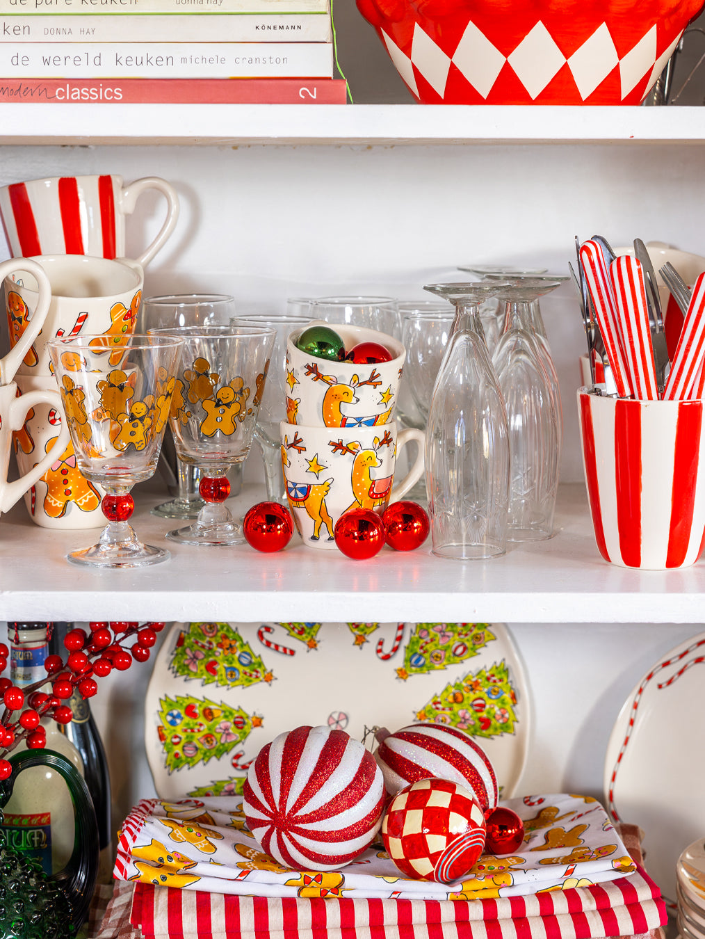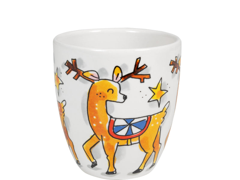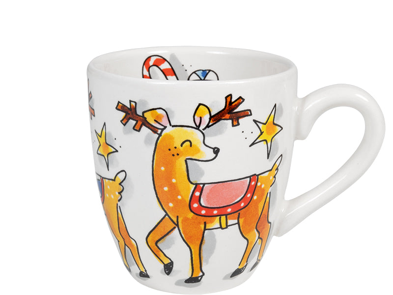 In deze mok zit niet alleen je koffie of thee, maar ook een stukje kerstplezier. Deze rendieren lopen vrolijk rond tussen de kerststerren, allemaal met de hand ontworpen in ons Blond atelier. De kerstcollectie van Blond Amsterdam is elk jaar weer een feestje om aan te werken. En dit item hoort daar helemaal bij. Met warme kleuren, herkenbare tekeningen en een knipoog naar traditie brengen we het kerstgevoel naar je keukenkast. Deze minimok past perfect bij de andere kerstproducten. Mix en combineer zoals jij dat wilt, voor een tafel die net zo eigen is als jij.